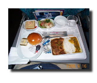 行きの機内食。スリランカ名物カレーです。カレー好きの私達にはとっても嬉しい。行きのカレーはあんまり辛くないんだよね。そのかわり(?)帰りのカレーの辛いこと。